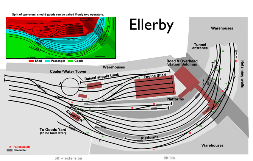 The layout is DCC controlled for rolling stock. The points are operated by a series of switches on the top side of the plans. Lights will also be operated by