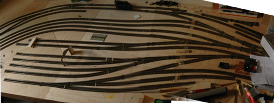 Photo of the track before being packed away. Station building off to the left (180 degree rotation to the plan above).
