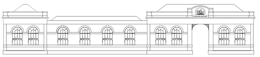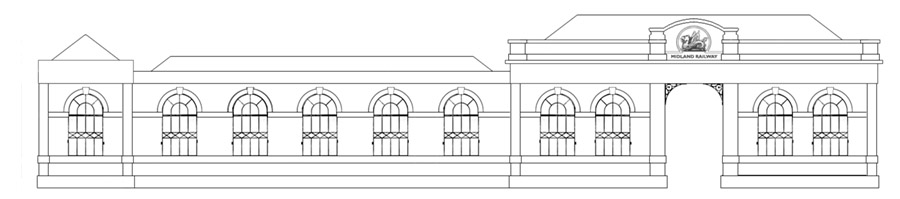 Alternate front with smaller end building for the left platforms steps down.